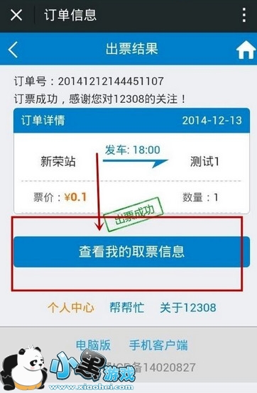 支付成功之后,系统跳转,显示出票成功,然后查看取票信息。(此步骤图片仅作为演示,实际应支付60元票价)