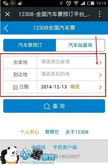 进入订票界面后,选择出发地、目的地和出发时间。