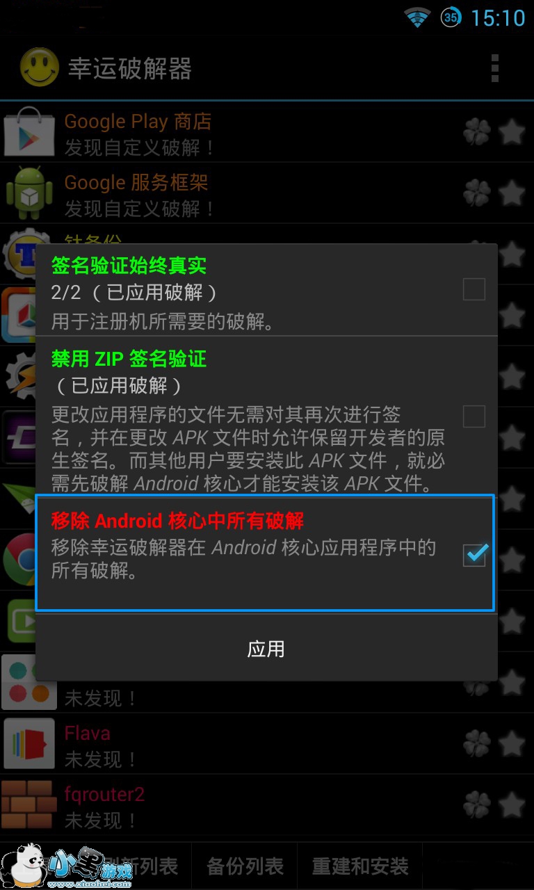 当然,解决方法还是很简单的。打开系统修改器——工具箱——Android核心修改,勾选第三选项“移除Android核心所有修改”,点击应用,随后设备会重启生效,之前应用的核心修改也会随之失效。