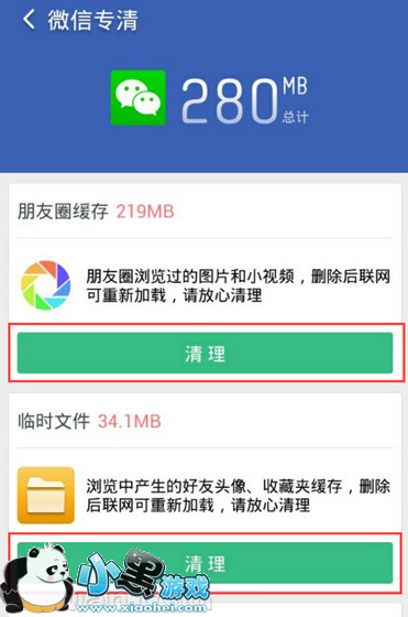 2、进入微信专清后,可以清理微信的四大缓存“朋友圈缓存”、“临时文件”、“聊天图片”、“聊天小视频”,其中朋友圈缓存和临时文件可以一键清理,而聊天图片和聊天小视频需要二次确认避免误删。