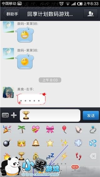 3、如果在信微里找不到满意的图标,不妨试试去手机QQ上找,如下图要在Emoji这一组表情里找,其它的是不能用的,手机QQ上还找不到满意的,可以去米聊,易信或其它一些软件上找,只要有 Emoji 图标的都可以用,当然看到好友的图标好看,也可以复制过来。