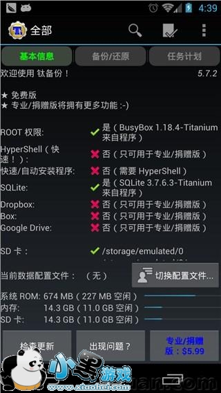 打开软件并给予ROOT权限后进入钛备份的主界面。在这里你可以看到这款软件和你手机的基本信息。建议新手仔细看看,这些信息非常有用。