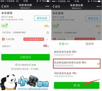 三、在进入的微信电影票购买界面,找到自己喜欢的电影票,并选择好座位后,就可以看到优惠券,点击进去选择你支付的红包点击使用即可。