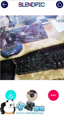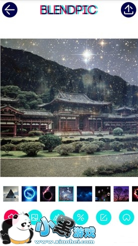 图片剪裁后就进入融合的界面了,BlendPic 内置了近百款梦幻色彩很浓的低曝图用作照片融合。从风格凌厉的三角形到广袤宇宙,从众人痴迷的模糊效果到五彩斑斓的色块拼接,可根据照片的风格及设想的效果进行选择。当然也可以选择自己现有的图片进行融合。图片下部第一排是整合图片的选择,第二排是功能按键,同样的没有文字只有图标,但这并未增加操作的难度,简单试用后就会发现操作非常简单,上手没有任何难度。
