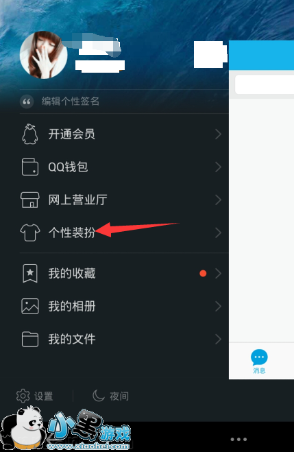 2、接着,在左侧弹出的选项框里我们单击【个性装扮】选项卡。