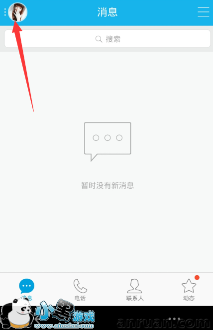 1、首先,将打开手机qq登录自己的账号,登录成功之后我们点击左下角【消息】按钮(默认即可),进入到消息模块就会发现在该面板的左上角会有自己的QQ头像,单击该头像。
