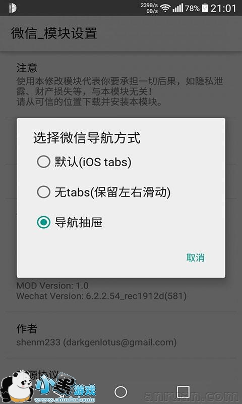 微信修改器利用Xposed 模块提供了 3 种导航样式:默认 iOS 风格、去导航栏和侧边栏样式。第二个风格仅屏蔽了底部导航栏,依旧可以通过左右滑动切换页面。而最后的侧边栏样式将完全切换为 Android 4.X 时代的 Holo 样式,左后滑动失效,必须从屏幕左边缘呼出侧边栏才能切换功能。值得注意的是,每次更改设置,我们必须重启微信,一般来说只要在从后台中把微信划走即可。