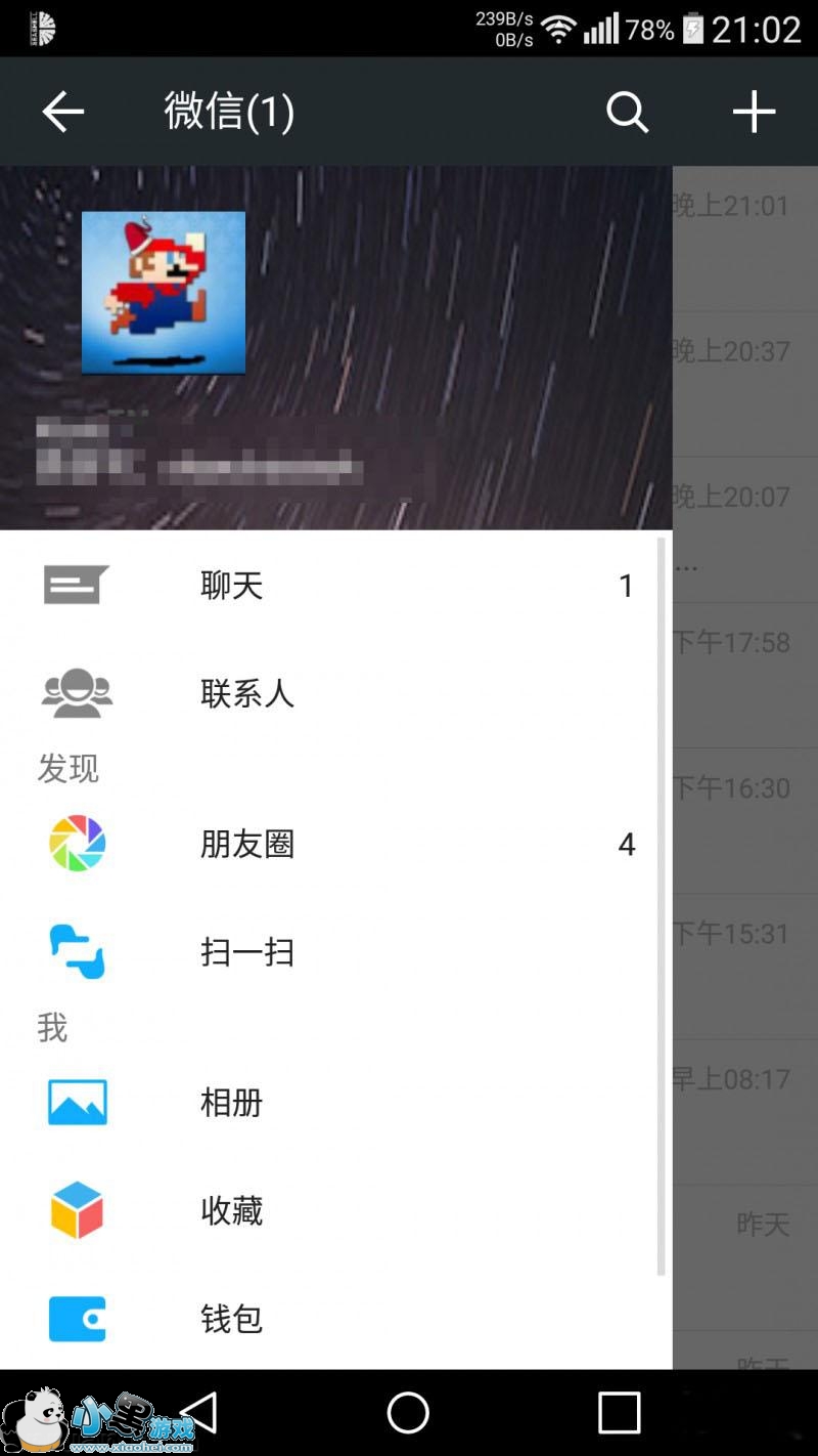 默认样式中的朋友圈新消息提示那一个小红点提示变成了「new」字样;新消息提醒也变成了单纯的数字,标记在「聊天」或「朋友圈」三个字后方。侧边栏上方的头像可以点击进入资料设置,背景图片也可以自行更改。但是,聊天和联系人图标与下方借助微信原生的图标相比非常违和。如果腾讯不会进行封杀,希望在后续版本中完善视觉体验。