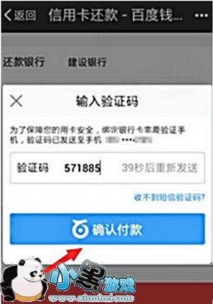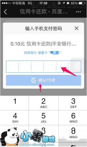 6、百度钱包就会自动选择绑定的银行卡进行信用卡还款,按照如图的要求输入你在百度钱包设置的支付密码,再点击“确认付款”。