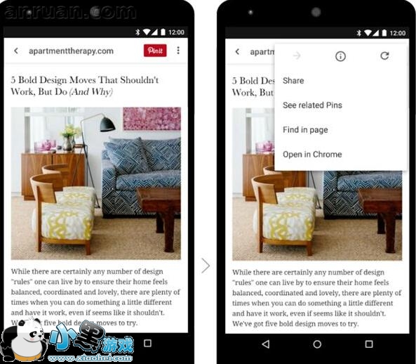 目前的显示为“open in chrome”,这样带来好处就是不仅可以在不中断用户体验的前提下直接在应用中显示网页内容,而且通过chrome特殊颜色的标签栏按钮及动画和Chrome Overflow菜单的更多选项,提高用户体验,小编要给32个赞。