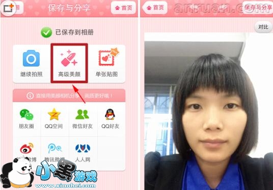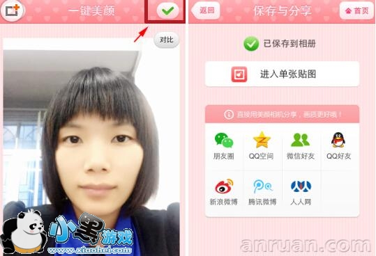 3、内置7种美颜风格,选择好后点击右上角的勾,同时还支持分享到微信朋友圈和qq等。