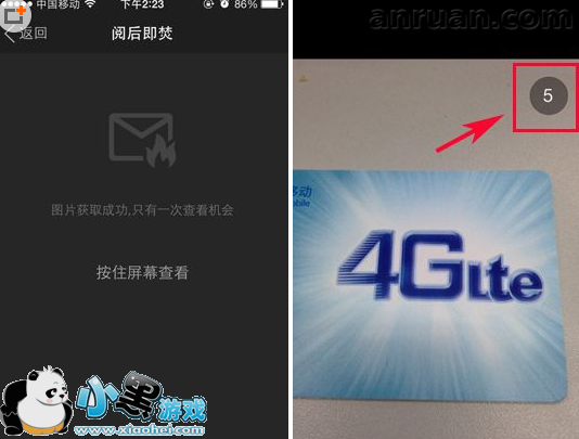 作为接收方收到图片后,点击图片打开,等图片获取成功后会提示你只有一次查看机会,自己做好准备后“按住屏幕查看即可”。在查看的时候,你可以看到右上角的秒数会开始计时,5妙以后即无法再打开该图片了。