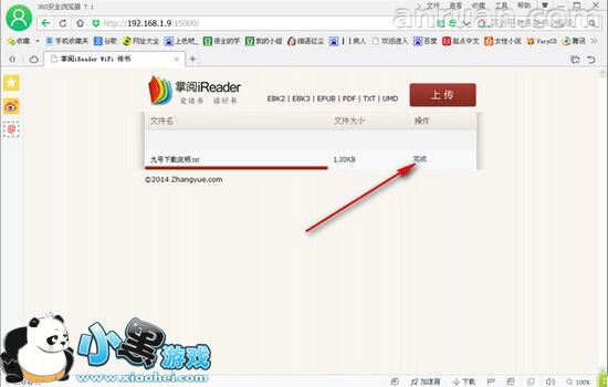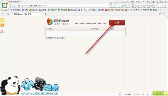 4、在电脑上打开浏览器,输入上面传书时出现网址,回车跳转至掌阅WiFi传书页面。