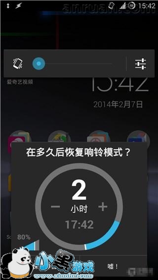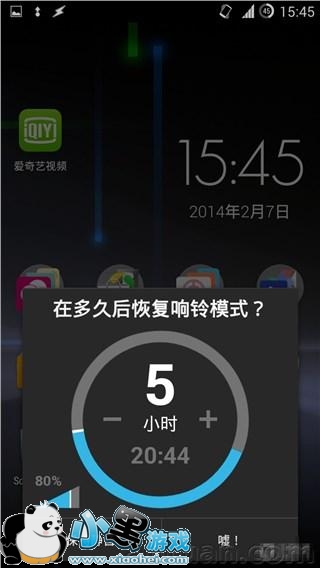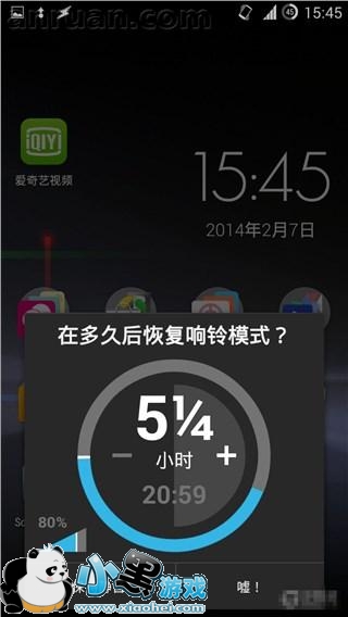 在圆环上点击或滑动可以调节恢复响铃的时间,最长支持12小时,点击加、减号两侧可以15分钟为单位进行小幅调节。 最后点击“嘘!”即可完成恢复响铃设置。点击“保持静音”则会使手机一直处于静音状态,恢复响铃需手动调整。