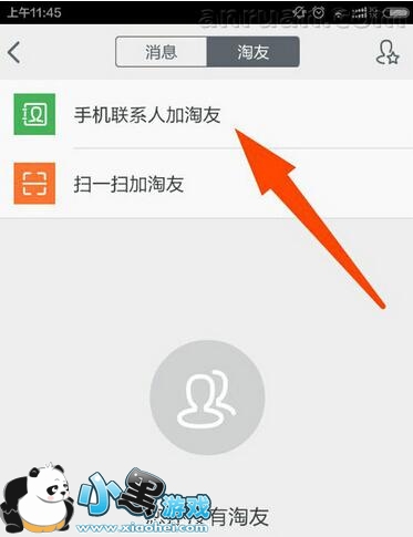 2、进入消息以后,选择右边的【淘友】,然后就可以选择通过手机的通讯录来添加好友。