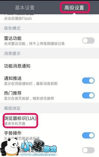 2、然后,进入设置里面的【高级设置】,找到浏览器标识选项。