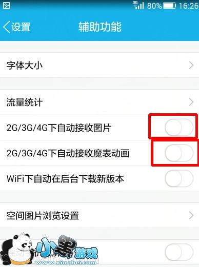 3、进入“辅助功能”,关闭“2G/3G/4G下自动接受图片”以及“2G/3G/4G下自动接受魔表动画”选项。