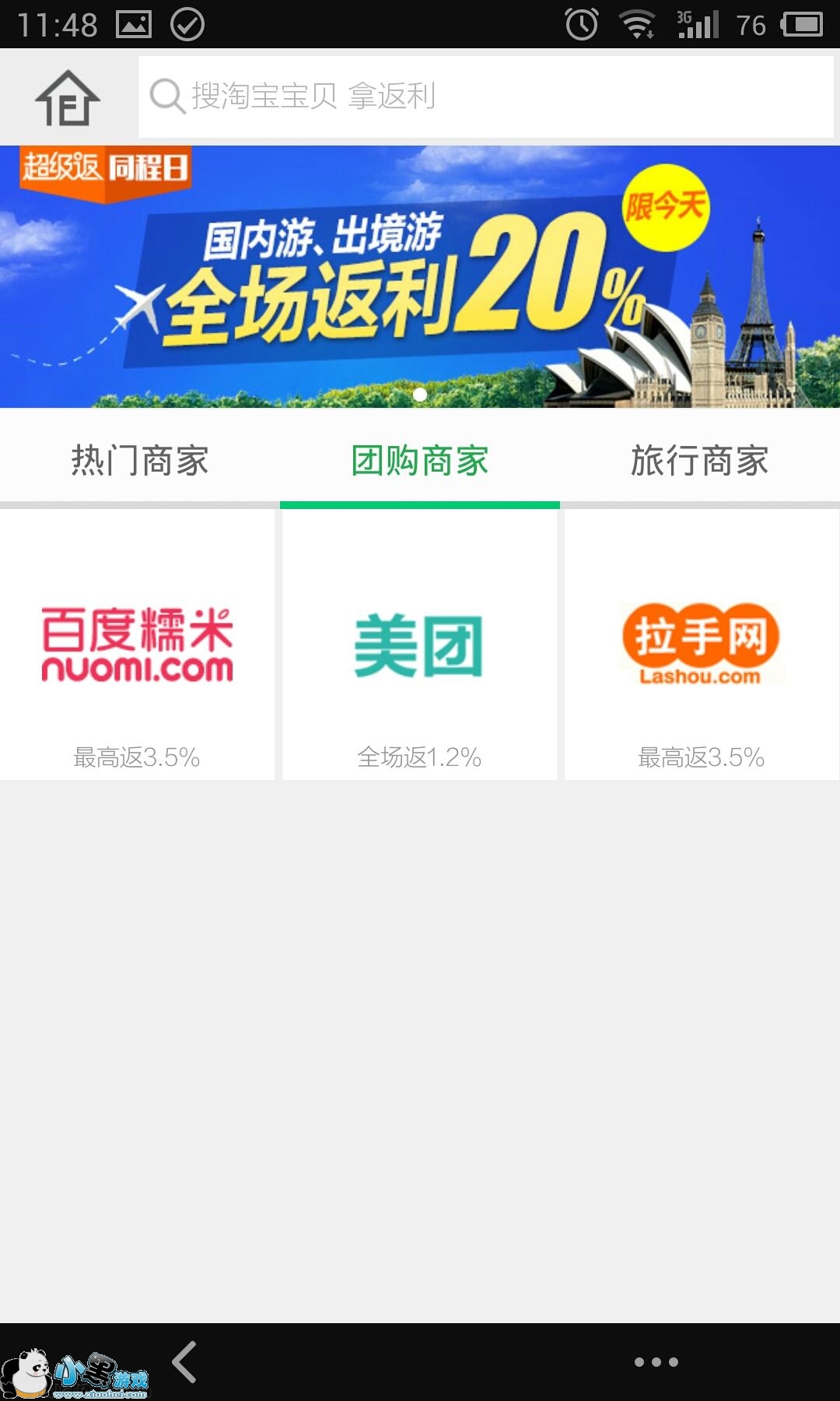 5、团购返利不用说也都知道,就是我们常用的团购软件,包含了美团、百度糯米以及拉手网,同时也会相应的给出返利额度,不过这里面返利的额度相比较其他的来说不是很高,因为团购本身已经给了很大的优惠。