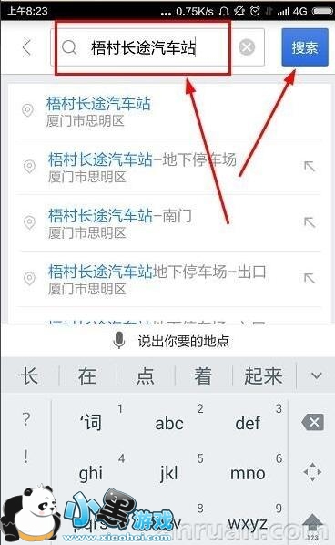3、在搜索框中输入我们要到达的目的地,如图梧村长途汽车站,然后点击搜索。