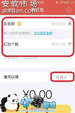 3.接着按照提示输入红包总金额以及红包个数,选择任何人可以领取,点击发红包,如图: