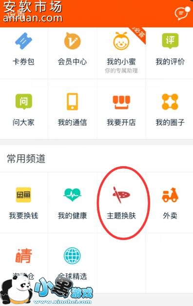 2、进入到个人界面中以后,下拉界面,大家就可以在常用频道中找到“主题换肤”这个功能选项了,找到以后就点击该功能进入,如下图所示