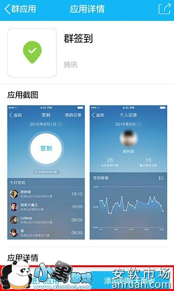 4、进入“群签到”应用详情,就可以了解到群签到应用详情,可以选择直接进入应用,当然如果需要,可以将它添加到聊天面板,以后签到就会更加方便了。
