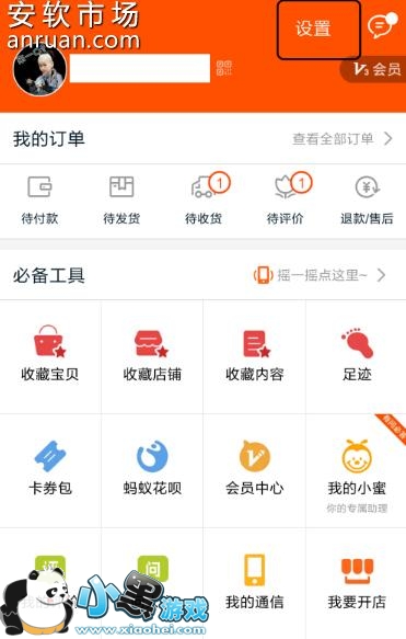 1、打开手机淘宝客户端,进入到手机淘宝主界面,然后点击界面下方“我的”这个功能选项,进入到个人界面中,在个人界面的右上角位置有一个设置按钮,点击该功能进入,如下图