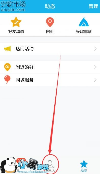 1、打开手机QQ,进入到手机QQ主界面中,然后点击界面下方联系人这个功能选项进入,如下图。