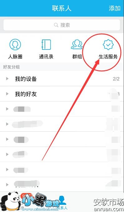 2、在联系人界面的最上面,有几个功能菜单,其中有一项功能是生活服务,点击“生活服务”功能进入,如下图。