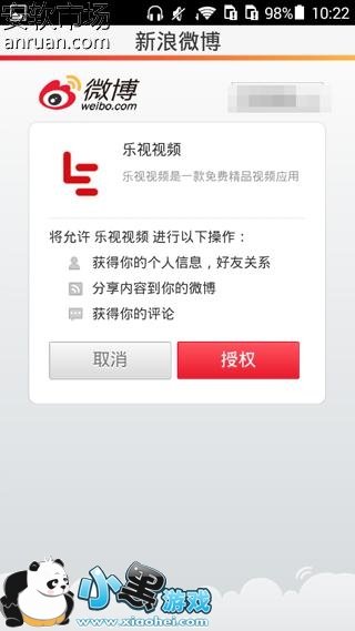 5、这时候新浪微博会提示你是否授权乐视视频关联你的帐号并简写相应的操作,如果你确定没有问题就点击授权按钮即可,如下图。