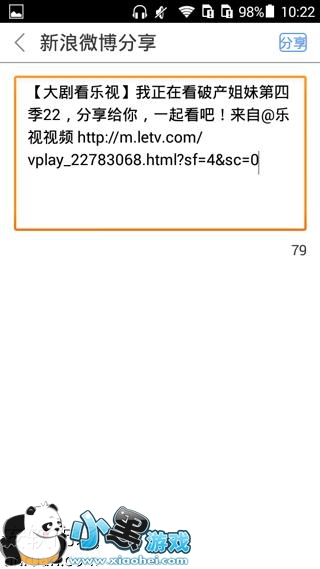6、授权成功以后,就会进入到新浪微博分享的窗口中了,点击分享按钮就可以把这个你喜欢的乐视视频节目给分享出去了。