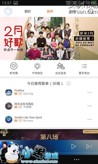 1、打开虾米音乐客户端,进入到虾米音乐主界面以后,可以看到官方推荐的一些歌曲,当然其中也有很多功能是我们自己可以手动选择的。