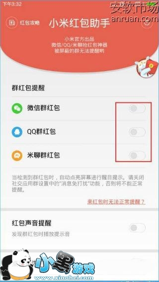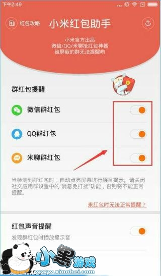 1、打开小米红包助手主页面后,即可看到默认的抢红包提醒都是开启的;