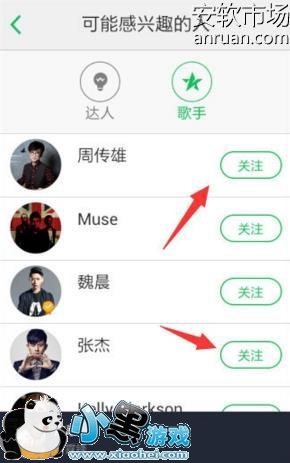 4、点击进入以后,系统会给一个你可能感兴趣或者是喜欢的歌手列表,在这些歌手名称的右侧会有一个“关注”的按钮,点击该按钮就可以关注那个歌手了,如下图。
