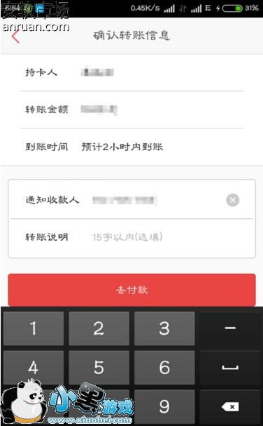 4、一般系统会提示你确认转账信息是否正确,大家可以在通知收款人那里填上收款人的手机号,这样系统会提示收款人什么时候到账,确认完毕后点击“去付款”。