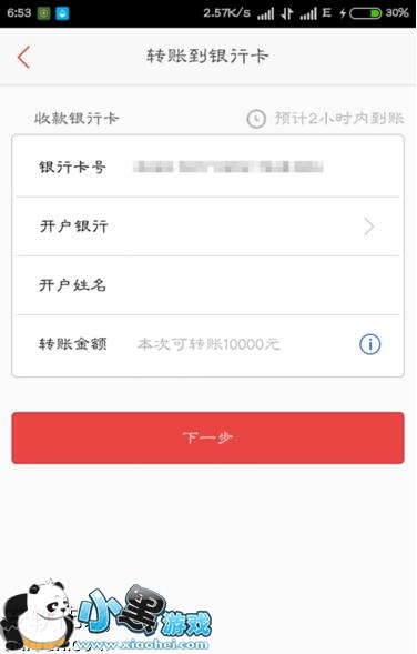 3、然后完成输入银行卡号、选择开户的银行、输入姓名及转账金额这四个步骤,确认没有问题以后点击“下一步”。
