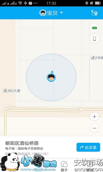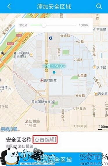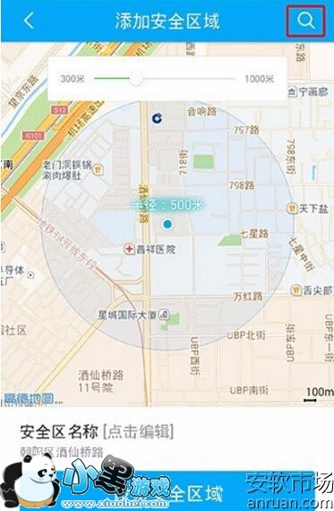 3、这时候就会进入到地图界面,一般都会需要定位下你当前的位置,当然也可以通过点击右上角的放大镜符号,搜索你指定要定位的位置,并且该位置还可以设定为安全区域的中心,如果你想 把安全区域的范围设置大一些,可以滑动360儿童卫士手表中地图的数轴,一般范围是300-1000米左右,选一个你认为合适的距离就可以了。