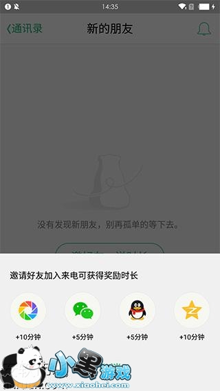 2、第一次使用我们是没有好友,我们可以通过又上角的“+”好直接添加联系人,也可以通过新的朋友同位QQ、微信、空间等方式要求好友,自己获取免费通话时间奖励: