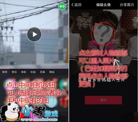 2.打开逗拍软件,选择要制作的场景。点击相机按钮看下图,导入素材后,点脸部位置,相机选取你先前拍下的照片,然后用两个手指调整照片。