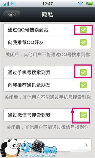 点击隐私之后进入到隐私设置窗口,在窗口上面分别将通过qq号搜到我,通过手机号搜到我,通过微信号搜到我后面的勾去掉,这样就不会让别人搜到了。