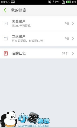 2、找到"我的"图标后,点击进入个人主菜单,找到“我的财富”,点击进入以后就可以看到自己的红包、奖金、立返账户等个人信息。
