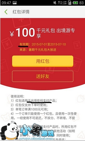 4、找到自己需要使用的红包,比如“千元礼包 出境游专享”,然后点击红包进入红包界面,仔细查看红包使用说明,尤其需要注意时间和旅行路线。
