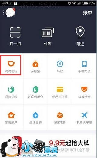 今年9月9号,滴滴打车正式更名为“滴滴出行”,为了庆祝他们更名,在支付宝的滴滴出行界面可以领取红包,周末出行的小伙伴们又可以免费乘车了,让我们一起来试试吧。 “滴滴出行”怎么领红包 1、首先我们打开支付宝,在首页就可以看到最新的标志——滴滴出行