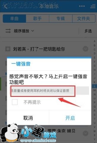 4、点击“增强”按钮向右侧滑动,出现了一个对话框,提示是否开启一键强音功能,而且提示如果用耳机时将关闭