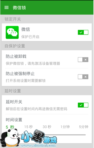 另外你还可以设置来实现被卸载或者被强制停止,这样即便是有人发现你使用密码锁保护微信也没有办法修改。当然如果你觉得每次进入微信都需要密码繁琐时,也可以设置延时开关,设置5分钟之内不用密码之类的,大家可以根据自己的设置需求去设置。另外就是左侧通知栏的伪装功能,完全不用担心别人看的密码,错误伪装,十分经典哦。