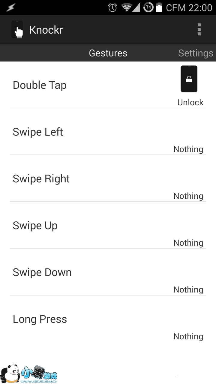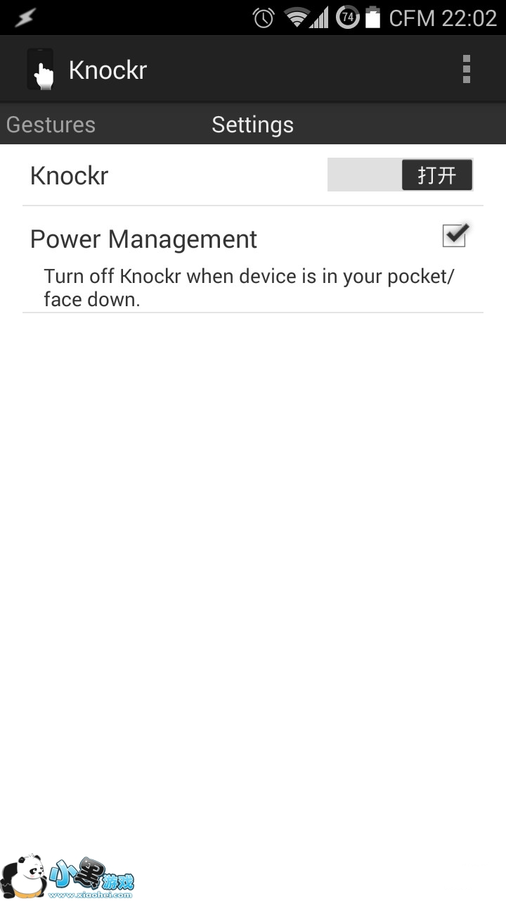 手势操作对应的功能除了亮屏和解锁外,再就是快速打开特定应用程序了。由于 Knockr 是使手机「伪关屏」,考虑到手机电量的宝贵,开发者还加入了电源管理。当手机屏幕朝下或被装入口袋中时,Knockr 会进入关闭状态,以避免误触和达到节约电量的目的。