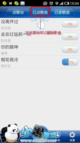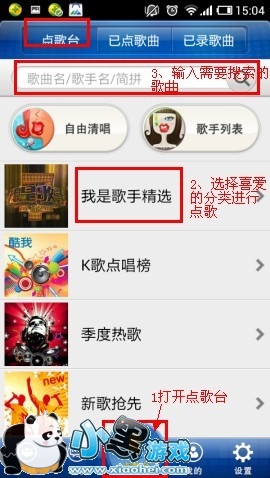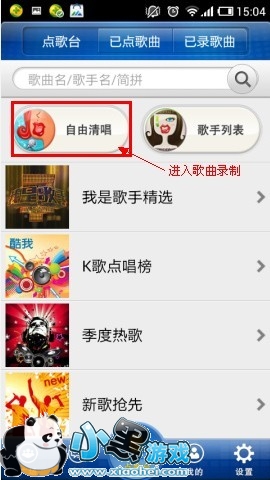 可以在“点歌台”标签页中,按歌手列表与榜单中选择歌曲,同时您也可以直接使用搜索功能来找寻自己喜欢的歌曲,选择好歌曲后,点击“点歌”按钮,已点的歌曲会添加到“已点歌曲”标签页中,之后,您可以进行播放以及录制的操作。