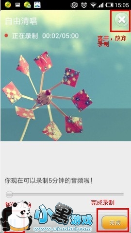 点歌完成后,进入录制的状态下,若您只唱了一部分时想停止时,您可以点击界面中的“停止”按钮,完成整首歌的录制后,就可点击“完成”。注意:点击录制后就尽量不要说话了哦,否则会被录到歌曲里面。