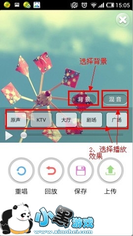 当您完成整首歌的录制后,将自动进入到后期处理步骤,选择背景,可添加自己靓照;神奇混音功能,打造你自己的好声音。