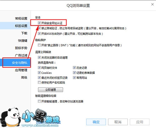3、进入“安全与隐私”==开启安全网址认证==点击确定(如下图)